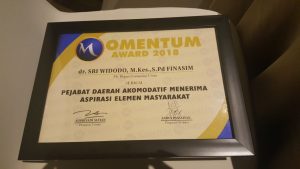 Penghargaan itu diterima dengan katagori “Pejabat Daerah Akomodatif Menerima Aspirasi Elemen Masyarakat”.