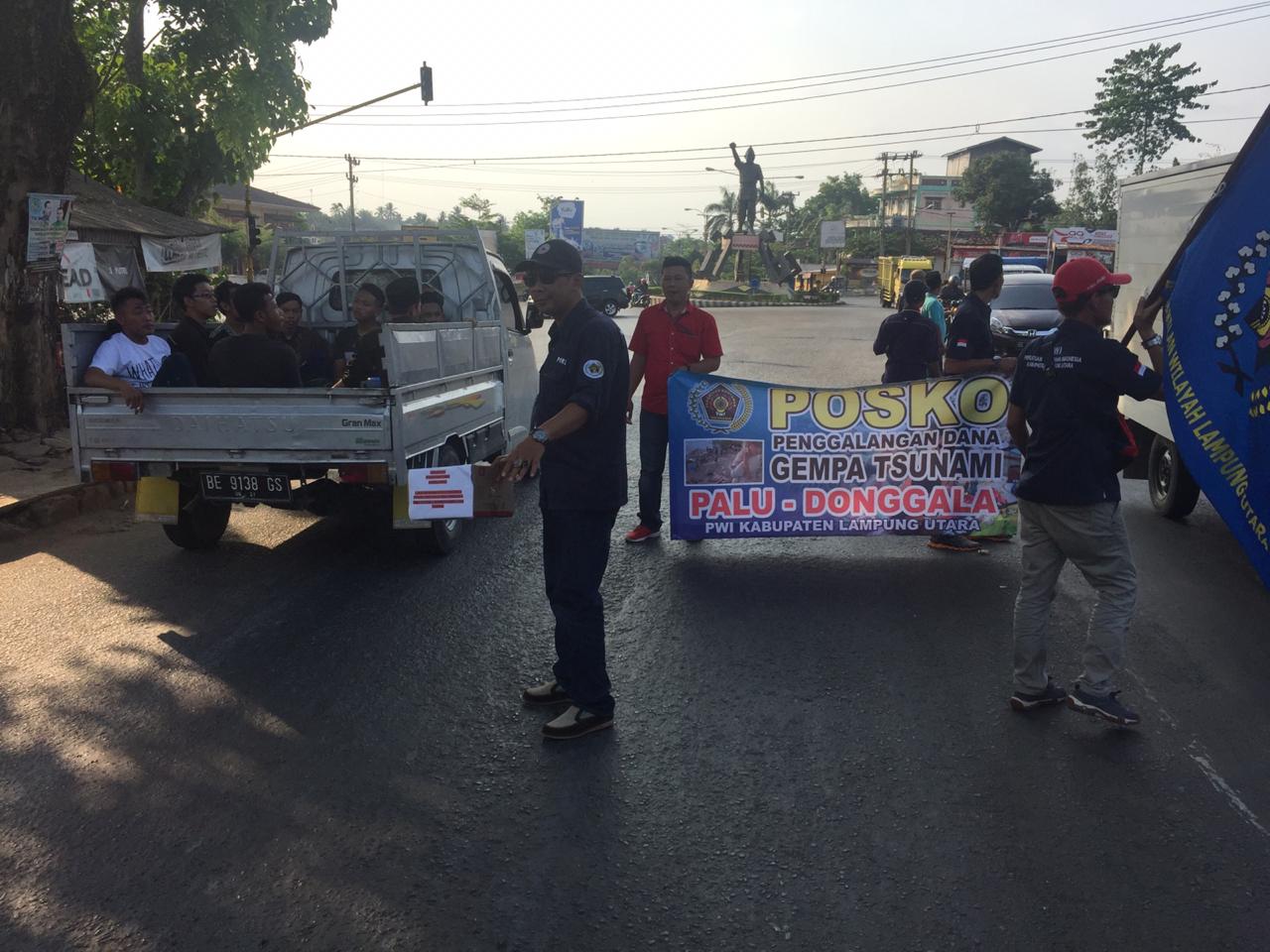 Selasa (2/10) puluhan anggota PWI Lampura menggelar aksi solidaritas dan penggalangan dana untuk membantu korban gempa bumi dan tsunami di Palu dan Donggala, Provinsi Sulawesi Tengah(Sulteng). Aksi tersebut dikomandoi langsung Ketua PWI Lampura, Jimi Irawan, dipusatkan di perempatan Tugu Alamsyah Ratu Prawira Negara(ARPN).