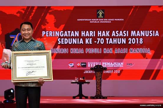 caption foto : Bupati Lampura Agung Ilmu Mangkunegara usai menerima penghargaan dari Kementerian Hukum dan HAM Republik Indonesia dalam kategori Kabupaten atau Kota peduli HAM.