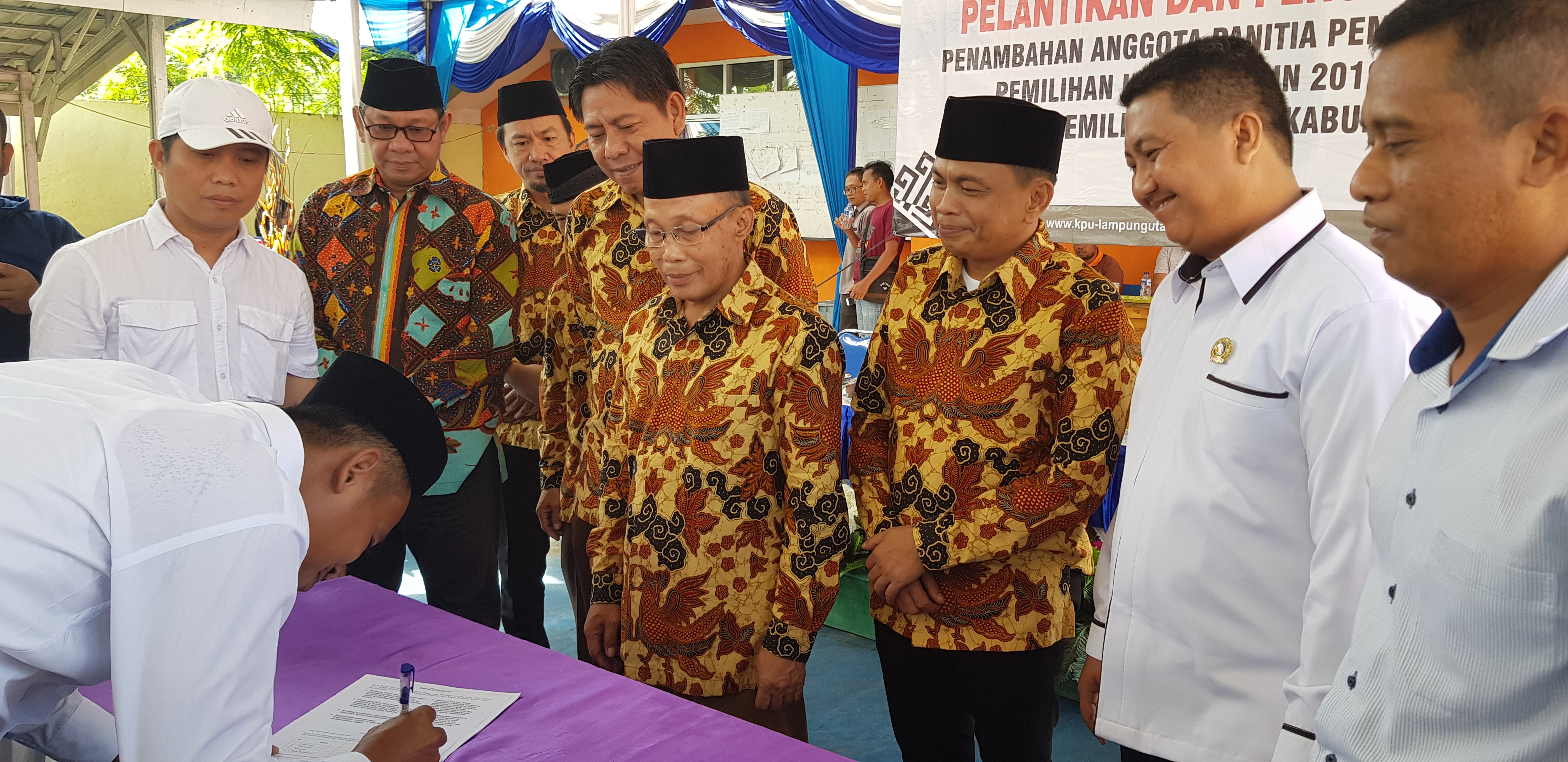 KOTABUMI–Sebanyak 46 anggota Panitia Pemilihan Kecamatan (PPK) tambahan, dilantik. Pelantikan dilakukan langsung oleh ketua Komisi Pemilihan Umum Daerah (KPUD) Lampung Utara (lampura) Hi. Marthon, diaula sekretariat KPU setempat Rabu (2/1). Pelantikan diawali dengan pembacaan sumpah dan janji, kemudian dilanjutkan dengan pembacaan fakta integritas.