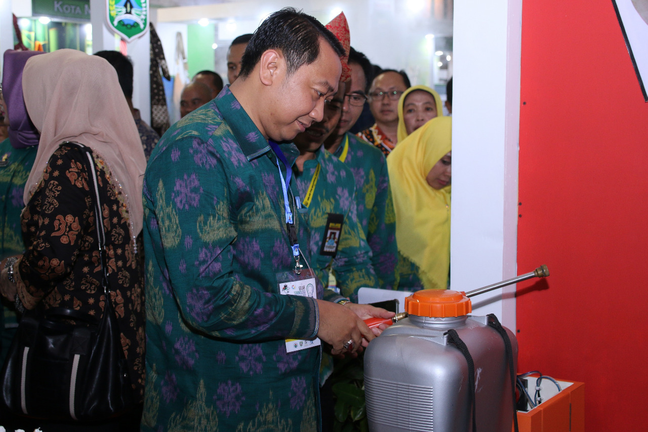 Foto : Diskominfo Lampura Caption : Bupati Lampura Hi. Agung Ilmu Mangkunegara saat memeriksa tank semprot otomatis karya warga Kecamatan Tanjungraja pada event TTG-XXI, di Bengkulu, Minggu(22/9).