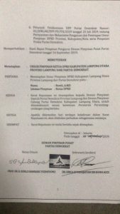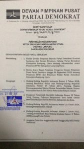 KOTABUMI–Romli, Amd dipastikan menakhodai DPRD Lampaung Utara (Lampura). Kepastian itu didapat setelah DPP Partai Demokrat (PD) mengeluarkan Surat Keputusan (SK) No.406/SK/DPP.PD/IX/2019 Tentang Penetapan Unsur Pimpinan Ketua DPRD Kabupaten Lampura Provinsi Lampung Dari Partai Demokrat. SK tertanggal 25 September tersebut ditandatangani langsung oleh SBY selaku ketua umum dan Hinca IP Pandjaitan selaku sekretaris Jendral.