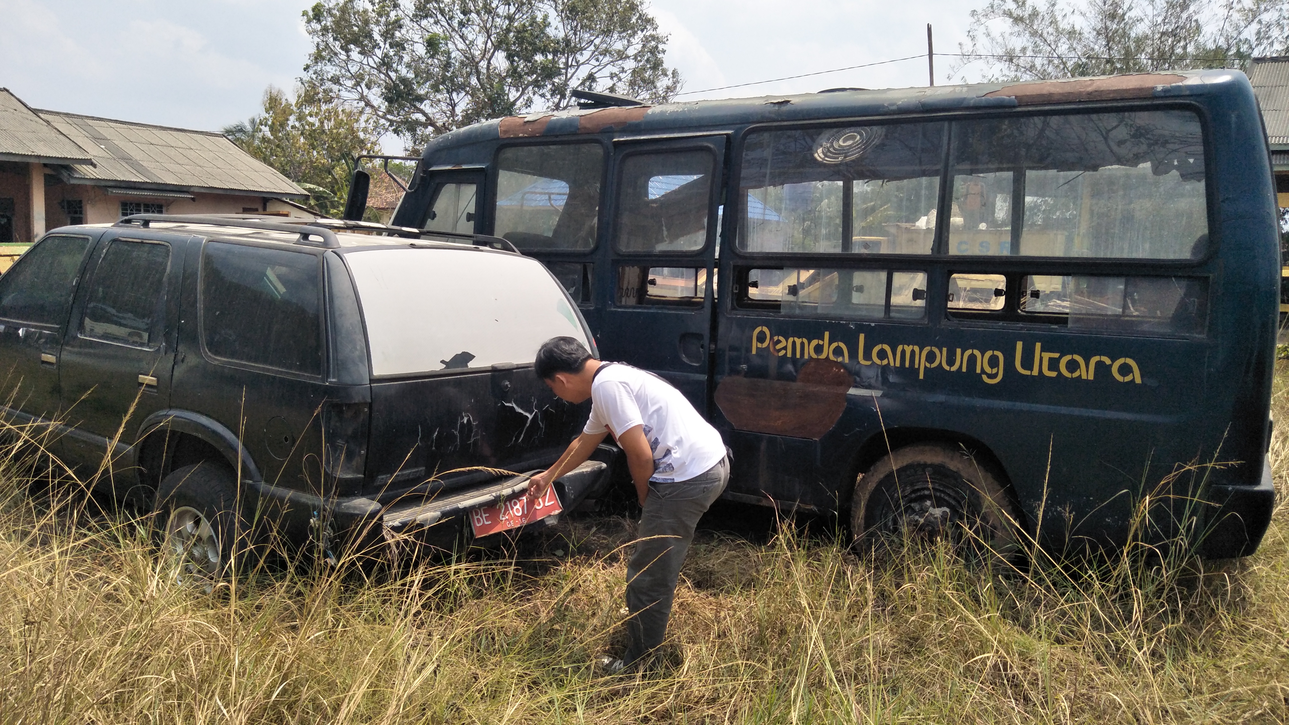 Foto cw9 Caption : Sejumlah kendaraan yang sudah rusak dan tak terpakai nampak terparkir dilahan persis di samping Kantor Dinas PUPR Lampung Utara, Senin (14/10).