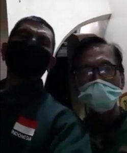 Caption foto : SA Oknum PNS Lampura (kiri), bersama TR Pasien Positif Covid-19 yang sedang menjalani isolasi di GSGIC Kotabumi