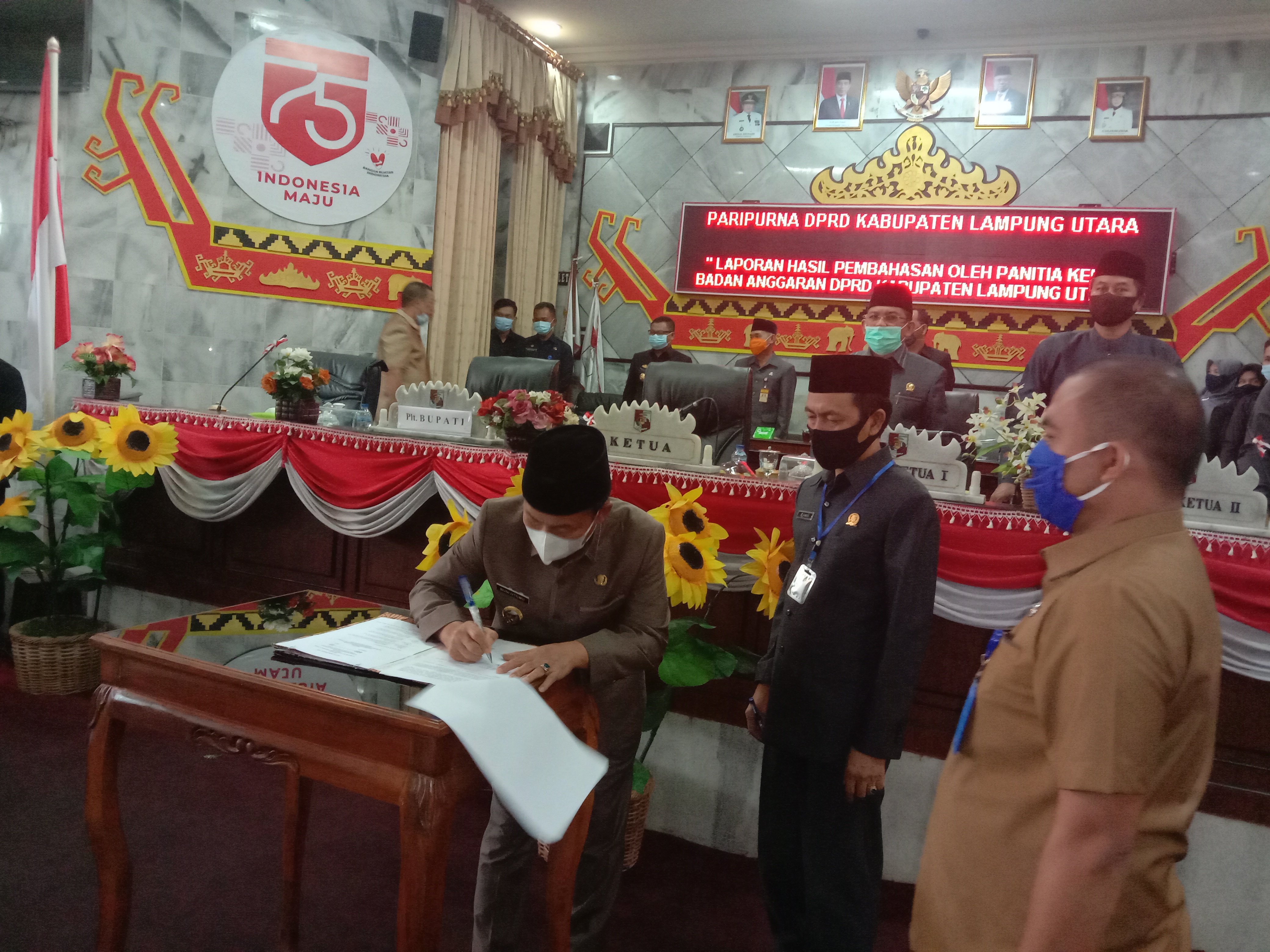 KOTABUMI–Plt.Bupati Lampung Utara (Lampura) Budi Utomo, bersama Romli, ketua DPRD setempat, menandatangani nota kesepakatan Rancangan Perubahan Kebijakan Umum Anggaran dan Rancangan Perubahan Prioritas Plafond Anggaran Sementara (KUA-PPAS) tahun anggaran 2020. Penandatangana itu dilakukan pada rapat paripurna yang digelar DPRD setempat, Kamis (24/9).