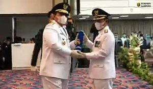BANDAR LAMPUNG — Gubernur Lampung, Arinal Djunaidi resmi melantik Bupati Lampung Utara Definitif sisa masa jabatan 2019-2024, Budi Utomo yang dilakukan di Lantai III Balai Keratun, Pemprov Lampung Selasa (3/11).