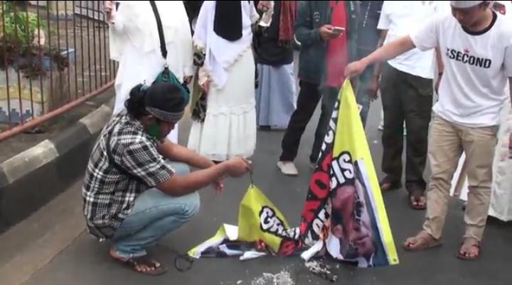 caption foto : Aksi unjuk rasa Aliansi Masyarakat Lampung Utara (AMLU) untuk memboikot produk Prancis, sempat diwarnai pembakaran foto Emmanuel Macron Presiden Perancis