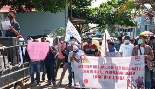 KOTABUMI––Buntut temuan Badan Pemeriksa Keuangan (BPK) RI atas ketidak sesuaian harga satuan bilik disinfektan dalam pengadaan yang digelar di Dinas Kesehatan Lampung Utara (Lampura) tahun 2020 lalu, membuat puluhan aktivis Perkumpulan Gerakan Kebangsaan (PGK), Rabu (31/3) turun kejalan. PGK inginkan persoalan ini menjadi terang benderang dan meminta pihak terkait menuntaskan persoalan tersebut. Sebab PGK mencium adanya aroma tidak sedap dan indikasi terjadinya markup anggaran pada pengadaan bilik disinfektan tersebut.