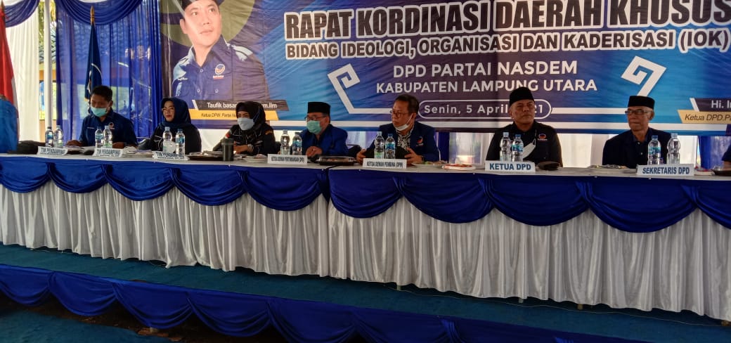KOTABUMI–Pemilu 2024 mendatang diperlukan intensitas kerja partai yg tinggi diseluruh strata organisasi partai. Karenanya DPD Partai Nasdem Lampung Utara (Lampura), menggelar Rapat Koordinasi Daerah khusus (Rakordasus) bidang IOK (ideologi, organisasi dan kaderisasi). Rakorsus tersebut dilaksanakan di Sekretariat Pemenangan Partai Nasdem Lampura, Senin (5/4), mulai pukul 09.30 WIB