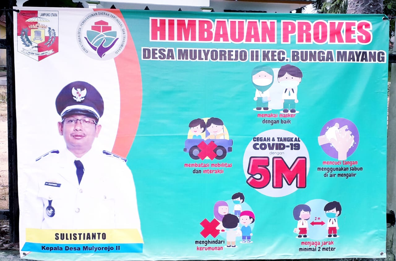 KOTABUMI—Sulistianto Kepala desa Mulyorejo II , Kecamatan Bunga Mayang, Kabupaten Lampung Utara (Lampura), menghimbau warganya agar selalu menerapkan Protokol Kesehatan (Prokes), seperti memakai masker, menjaga jarak, mencuci tangan, menghindari kerumunan serta membatasi mobilitas dan interaksi. Hal tersebut bertujuan untuk mengurangi penyebaran Covid-19 itu sendiri. Mengingat kondisi saat ini, dimana pandemi Covid-19 belum juga reda termasuk di Lampura.