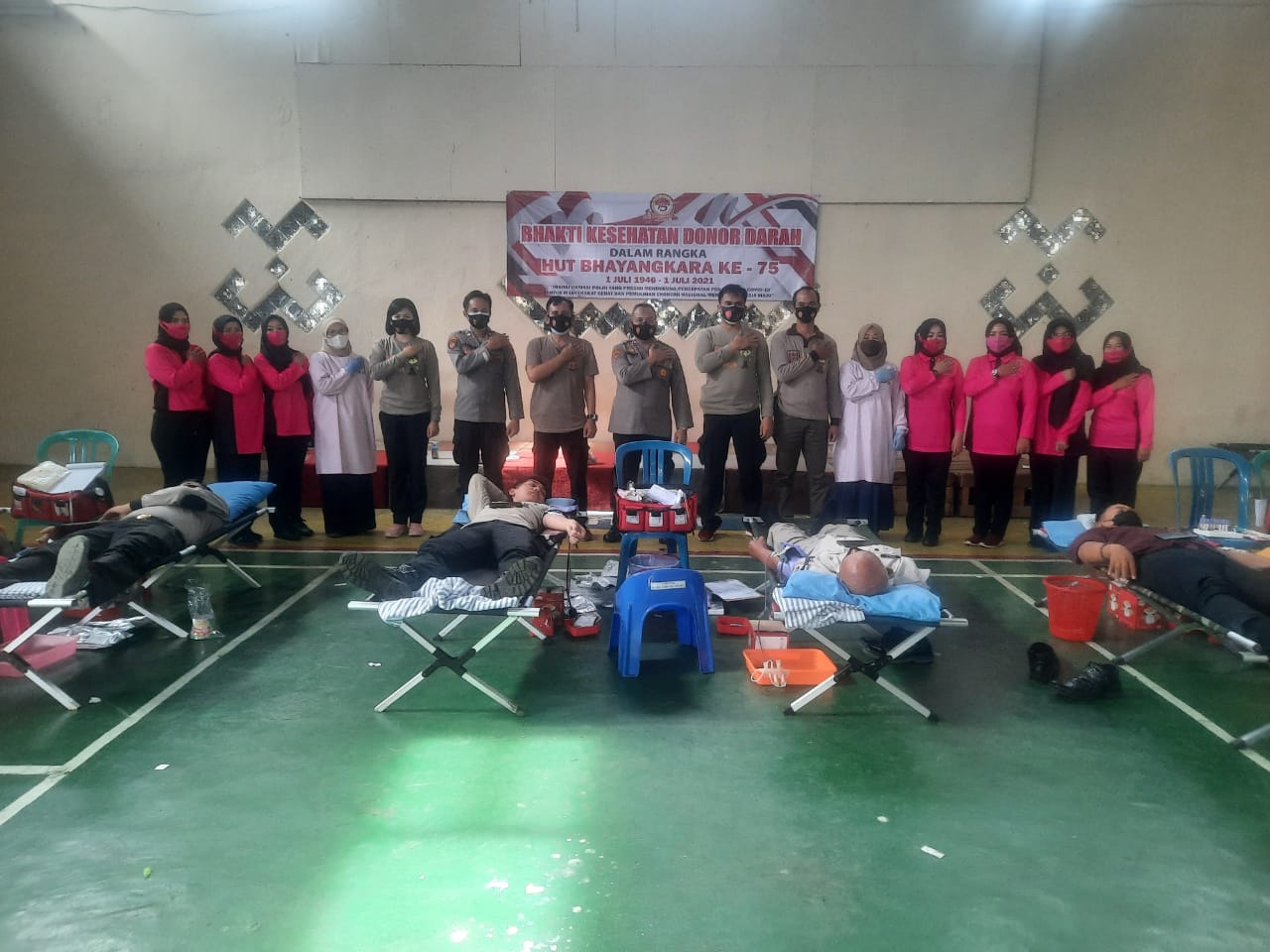 KOTABUMI — Dalam rangka menjelang HUT Bhayangkara ke-75 Personil dan Bhayangkari Polres Lampung Utara (Lampura) menggelar Donor darah yang di gelar di GWS Polres setempat, Selasa (22/6).