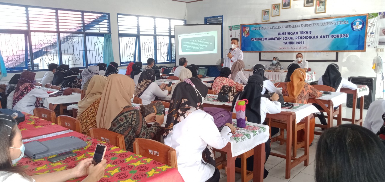 KOTABUMI–Menuju Indonesia terbebas dari korupsi tahun 2045, Dinas Pendidikan dan Kebudayaan(Disdikbud) Kabupaten Lampung Utara(Lampura) mengadakan Bimbingan tekhnis kurikulum muatan lokal Pendidikan Anti Korupsi tahun 2021.