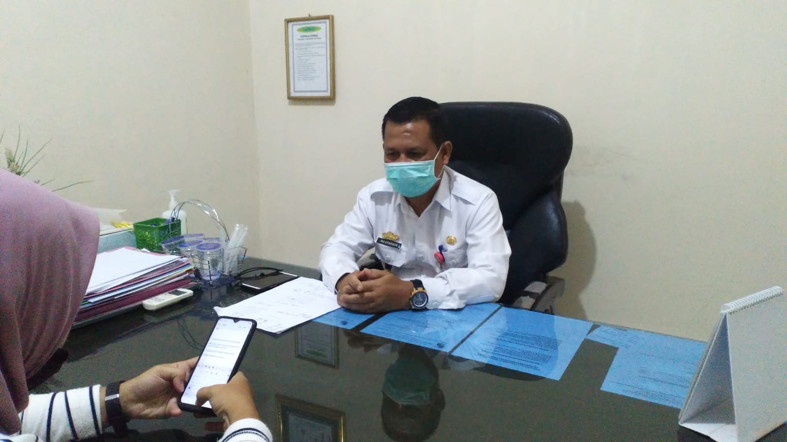 Foto Kadisnakertrans Lampura Maspardan saat diwawancarai di ruang kerjanya, Kamis(7/4).