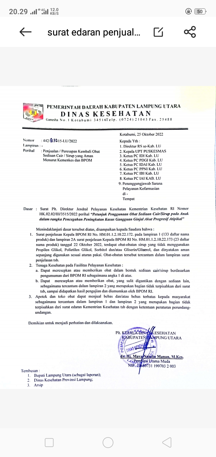 KOTABUMI-Pemerintah Kabupaten(Pemkab) Lampung Utara(Lampura) melalui Dinas Kesehatan(Dinkes) Setempat, mengeluarkan Surat Edaran(SE) No 442/8132/15-LU/2022 perihal penjualan peresepan kembali obat cair sirup yang aman menurut Kemenkes dan BPOM(Badan Pengawasan Obat dan Makanan).