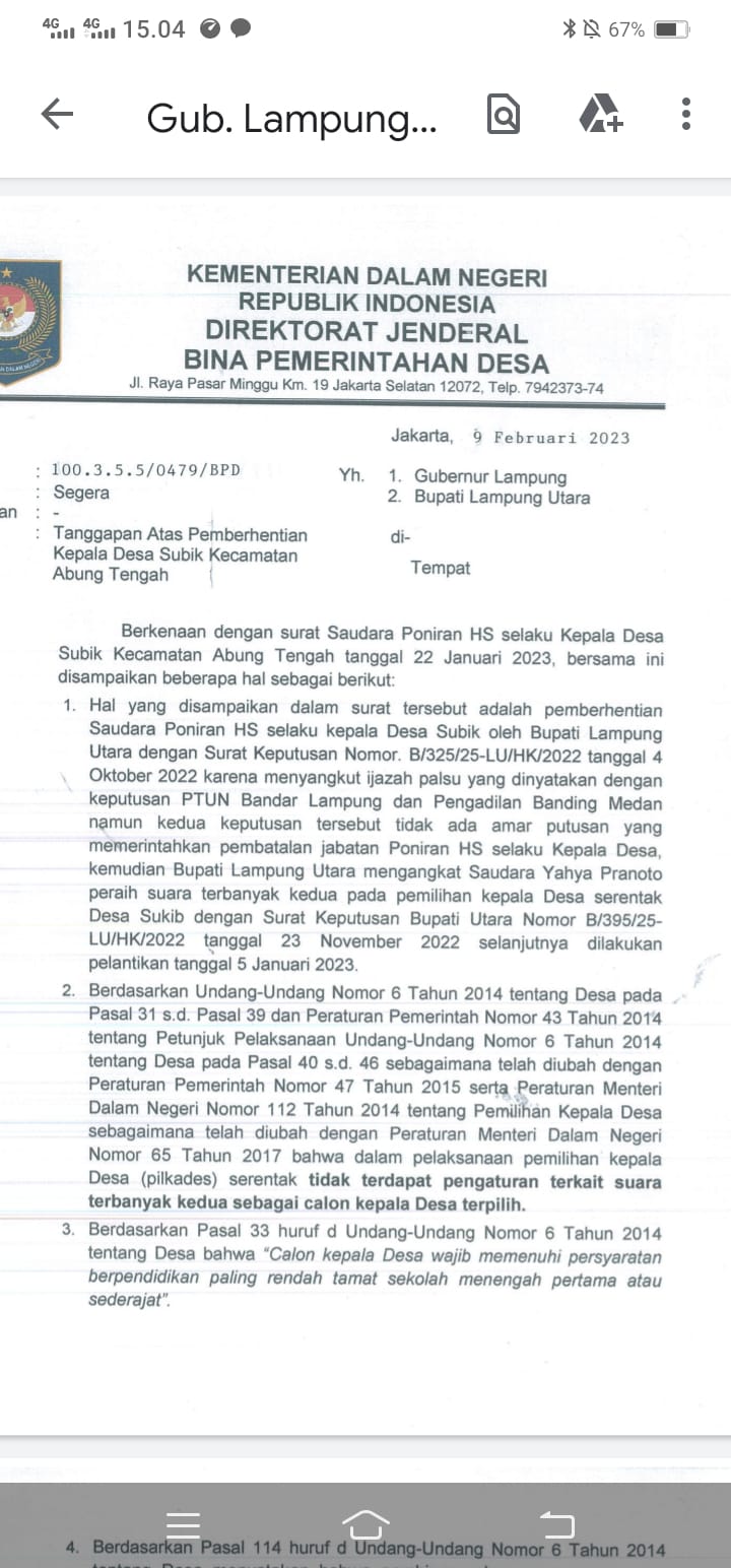 KOTABUMI—Pengakatan dan pelantikan serta pengambilan sumpah jabatan Yahya Pranoto sebagai Kepala Desa (Kades) Subik Kecamatan Abung Tengah kabupaten Lampung Utara (Lampura), masih menyisakan masalah. Teranyar Dirjen Bina Pemerintahan Desa mengeluarkan surat perihal Tanggapan atas pemberhentian kepala desa Subik Kecamatan Abung Tengah nomor : 100.3.5.5/0479/BPD yang ditujukan kepada Gubernur Lampung dan Bupati Lampung Utara. Intinya bahwa pembatalan jabatan Poniran HS selaku Kepala Desa dan mengangkat Yahya Pranoto, tidak berdasarkan aturan yang ada.