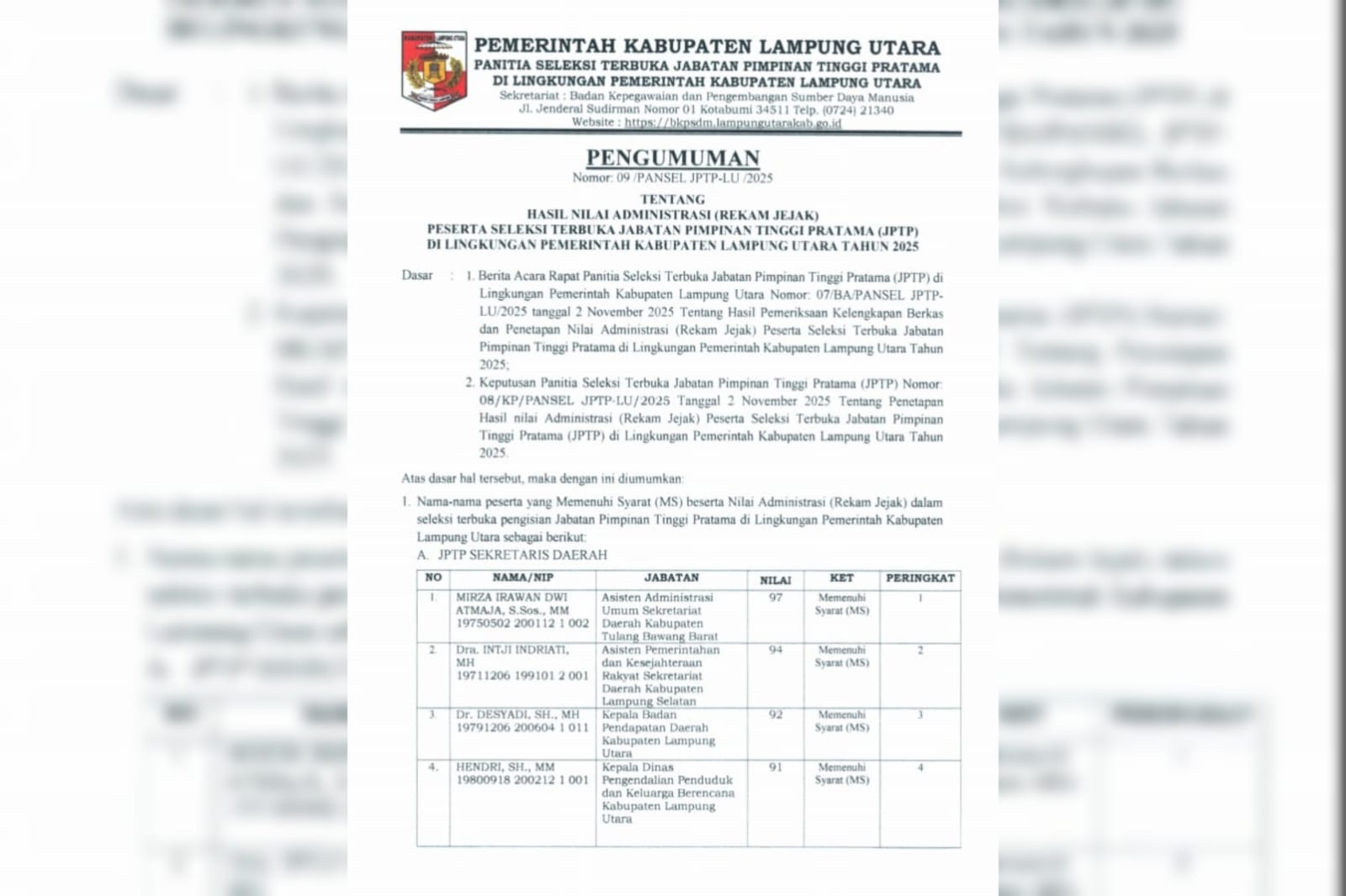 KOTABUMI-Setelah dinyatakan Lulus seleksi hasil Administrasi(rekam jejak) Seleksi Terbuka Jabatan Pimpinan Tinggi Pratama(JPTP), Besok(4/11 hingga 5/11) 19 Pejabat yang memperbutkan Empat Kursi Pimpinan salah satunya kursi Jabatan Sekretaris Daerah (Sekda) akan mengikuti Uji Kompetensi(Ukom) di Hotel Holiday inn bukit Randu Bandarlampung.”Hari ini pengumuman sudah kita umumkan melalui https://lampungutarakab.go.id/hasil-nilai-administrasi-rekam-jejak-peserta-seleksi-terbuka-jabatan-pimpinan-tinggi-pratama-jptp-di-lingkungan-pemerintah-kabupaten-lampung-utara-tahun-2025/. Di situ bisa dilihat siapa saja yang Lulu seleksi administrasi untuk selanjutnya mengikuti tahap seleksi Ukom,”ucap PLT. Kepala Badan Kepegawaian dan Pengembangan Sumber Daya Manusia (BKPSDM) Lampura Hendri Dunant, Senin(3/11).